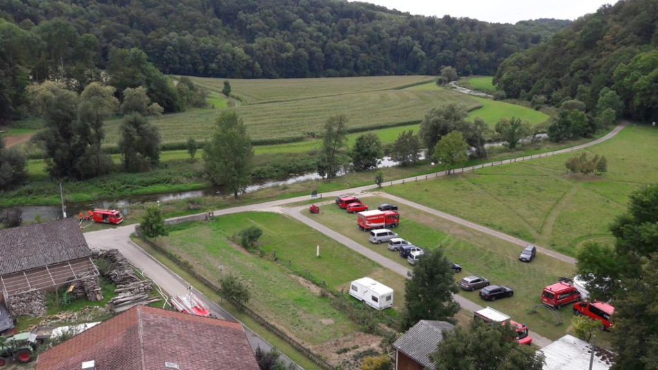 Nach der Rettung über die Drehleiter wurden die Personen durch Einsatzkräfte an der Einsatzstelle versorgt und betreut. Während des Einsatzes erfolgte die Löschwasserversorgung Großteiles über die angrenzende Jagst.
